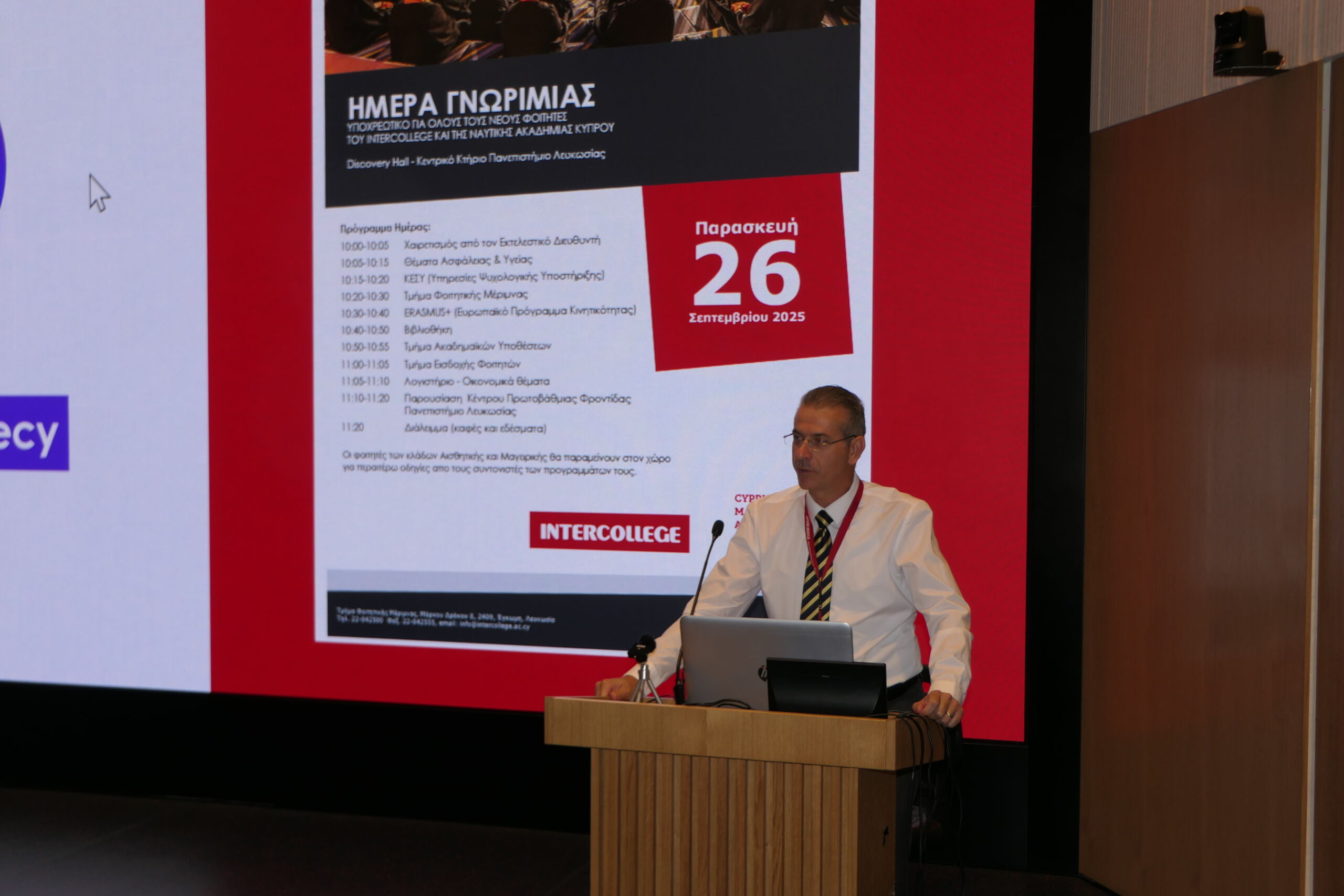 Η Ημέρα Γνωριμίας Φοιτητών του Intercollege και της Ναυτικής Ακαδημίας Κύπρου αποτελεί θεσμό που σηματοδοτεί την έναρξη της φοιτητικής πορείας για τους νέους εισακτέους σε όλα τα προγράμματα σπουδών. Σκοπός της εκδήλωσης είναι να προσφέρει στους φοιτητές πολύτιμες πληροφορίες για την ακαδημαϊκή και κοινωνική τους ζωή, να τους εξοικειώσει με τις διαθέσιμες υπηρεσίες και να τους φέρει σε επαφή με το εκπαιδευτικό και υποστηρικτικό περιβάλλον του Κολλεγίου. Παράλληλα, δίνεται η ευκαιρία για τη δημιουργία δεσμών συνεργασίας και φιλίας, που θα τους συνοδεύουν καθ’ όλη τη διάρκεια των σπουδών τους.